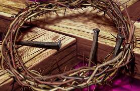 A crown of thorns, a batch of large rough nails and a wooden Cross.